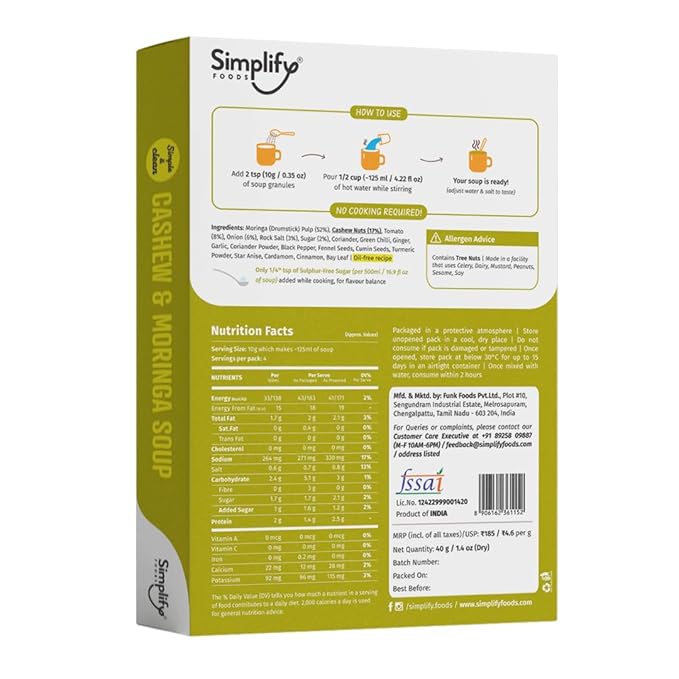 Simplify Foods Cashew & Moringa Instant Soup | Made with 52% Real Moringa Pulp | Pack of 2 (Each Makes 500ml) | Just Add Hot Water | No Cooking Required | Clean Label | 0% Additives or Preservatives