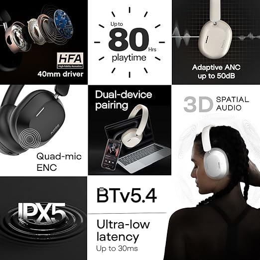 Noise Airwave Max 5 Wireless Over-Ear Headphones with Adaptive Hybrid ANC (up to 50dB), HFA Tech, 80H Playtime, Dual Pairing(Calm White)