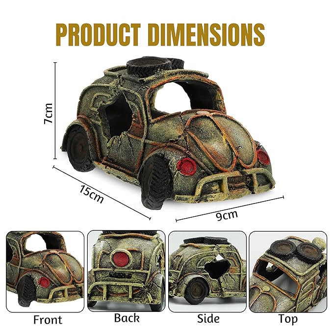 Foodie Puppies Thematic Ornament Resin Aquarium Decor - (2-Tier Broken Car, Medium, 15 x 9 x 7 cm) Unique Hideaway Natural Looking Landscape for Fish Tank Accessories, Pond and Turtle House