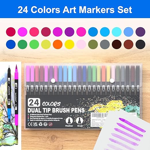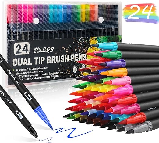 24 Colors Dual Tip Art Markers Sketch Pens with Carrying Case for Painting Sketching Calligraphy Drawing, Fine and Brush Tip Permanent Colouring Marker Pen for Kids Adult, Multicolor (24)