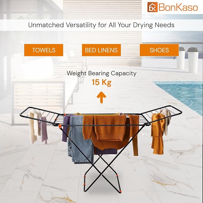 BonKaso Foldable Cloth Drying Stand for Drying Clothes, 3-Way Folding with 20 Drying Rails, Lightweight Alloy Steel, Flat Folding Design | Indoor & Outdoor Clothes Dryer