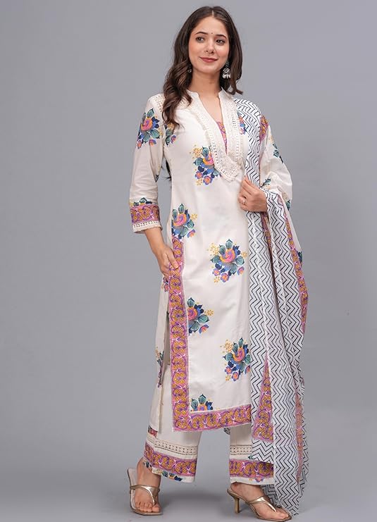 Pure Cotton Printed Straight Kurta Set with Palazzo Pants & Dupatta- Ethnic Wear, White