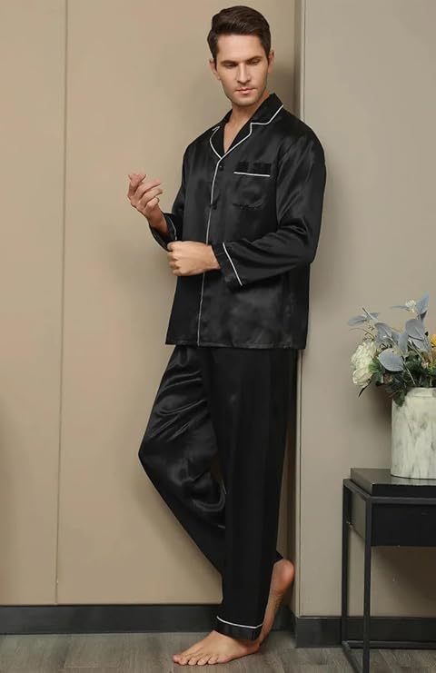 FASHIONGALLERIA Satin Pajamas Set, Long Sleeve Satin Pajamas for Men Sleepwear Button Down Pjs Set Night Suit Night Dress for Men