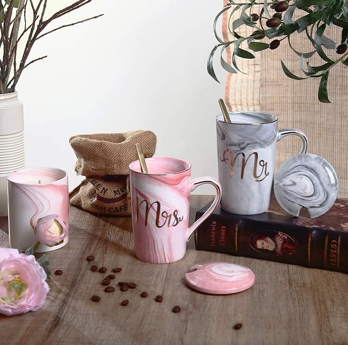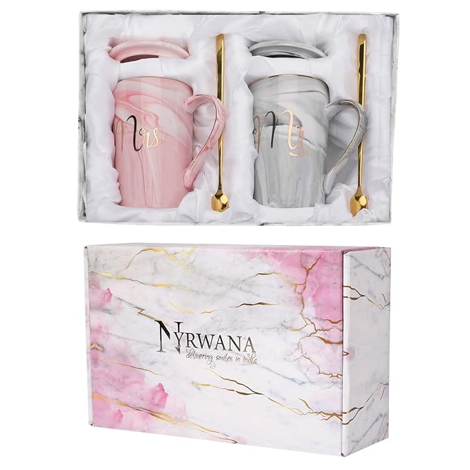 NYRWANA Coffee Mug, Marriage Gifts for Wedding, Wedding Present for Couples, Couple Present, Christmas Gifts, Mr & Mrs Set of 2 Coffee Mugs, Lids, Golden Spoon and Beautiful Gift Box (380ml-Ceramic)