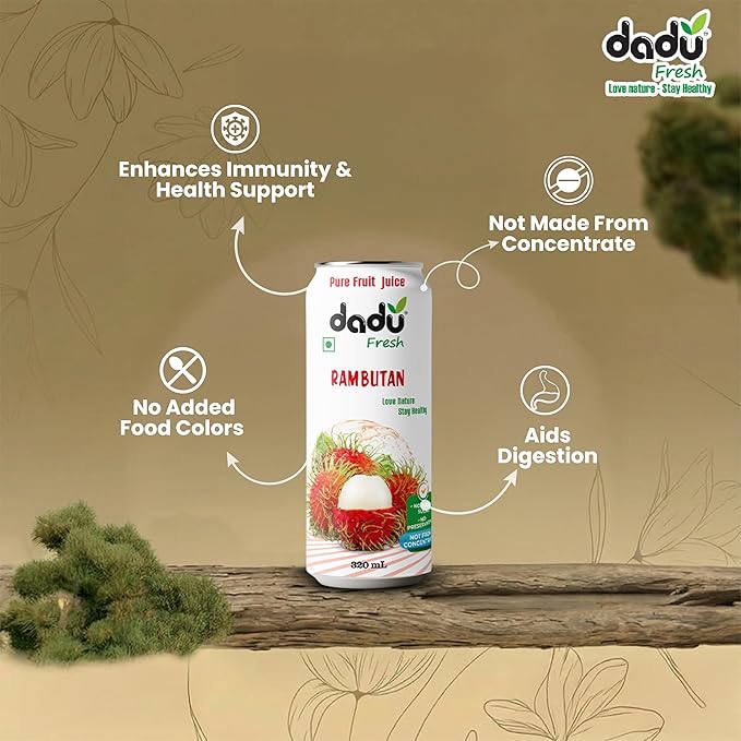 Dadu Fresh Rambutan Juice | Pure Natural Fruit Healthy Beverage | Not from Concentrate, No Added Sugar, No Preservatives or Artificial Flavours | Vitamin Rich & Naturally Refreshing | 4 Cans x 320ml (1280ml)