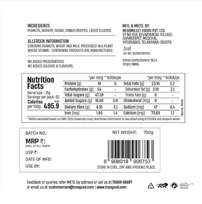 Item Weight 750 g Type Nutrition Flavour Millet Diet Type Vegan Product Benefits Complete Nutrition, Digestive Health, Energy Boost, Gut Health, High Fiber, High Protein Number of Items 50 Net Quantity 750.0 Grams Brand TROOGOOD