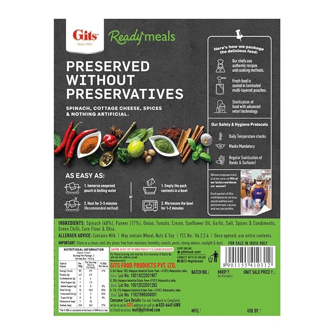 Item Weight 285 Grams Brand Gits Diet Type Vegetarian Number of Items 1 Flavour Palak Paneer Item Weight 285 Grams