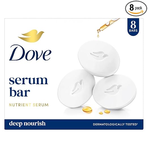 and Dove Item Weight 800 Grams Item dimensions L x W x H 8.5 x 6.1 x 3.5 Centimeters Scent Floral Age Range (Description) Adult Skin Type Dry Item Package Quantity 1 Product Benefits Nourishing Special Feature Scented Item Form Cream See more About this item Dove Serum Bar enriched with Nutrient Serum gives you visibly healthy, nourished skin. Dove Serum Bar with Nutrient Serum helps repair skin damage. Dove Serum Bar has pH balanced formula, which makes it gentle on skin and suitable for all skin types. Dove Serum Bar is free of parabens, sulphates and phthalates with no harmful components, leaving your skin feel visibly nourished all day long. Dove Serum Bar is Dermatologically Tested. Try Dove’s Expert Serum Bar Range for all skin types – Deep Nourish, Fresh Hydrate, Pink Radiance, Sensitive Care and Sandal Glow.