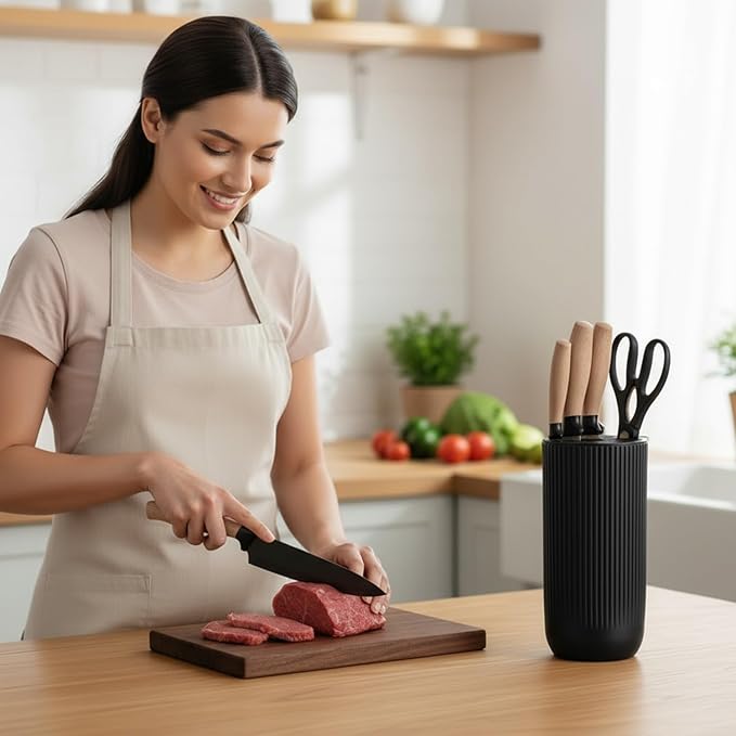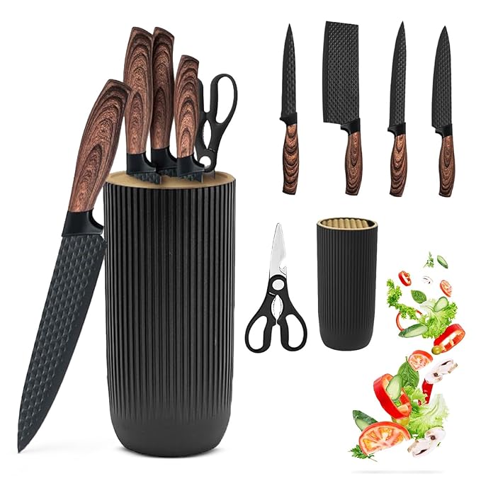 MYOZ 6-Piece Kitchen Knife Set with Block Holder | Ultra-Sharp Anti-Rust Stainless Steel Chef Knife Set with Wooden Handles & Scissors | Cleaver, Utility & Paring Knives for Home Cooking